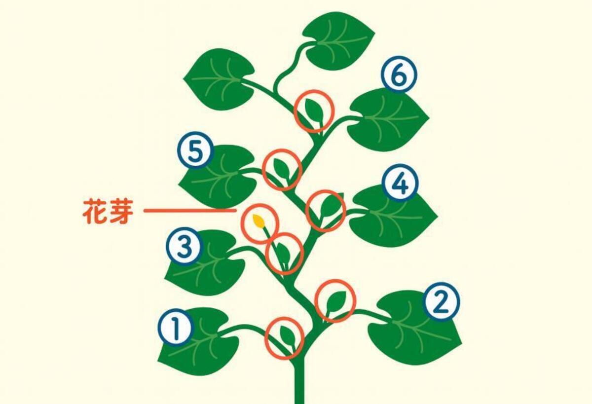イラストの①〜⑥の節までのわき芽(成長すると子ヅルになる)を取ります。