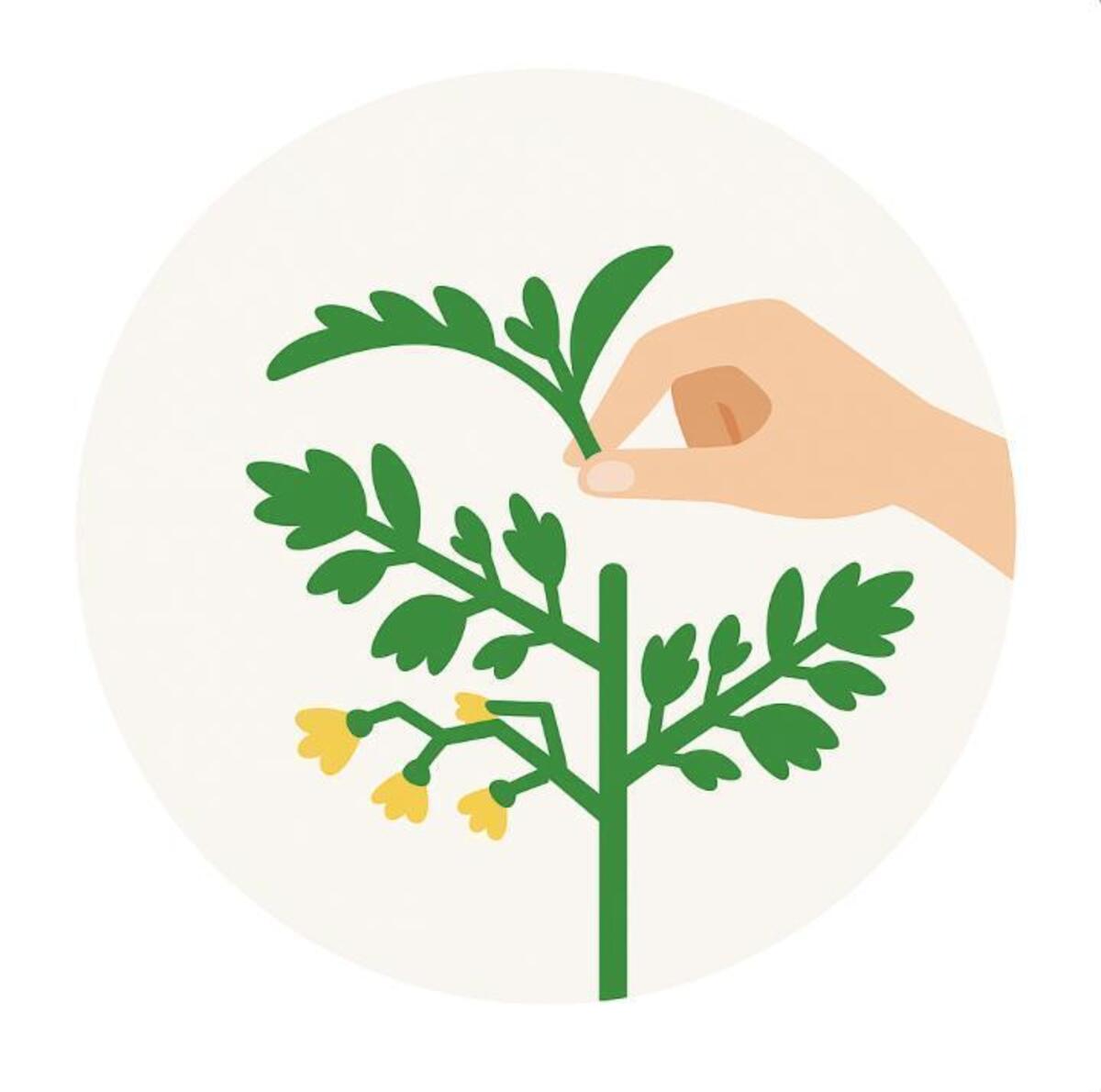 株の成長に応じてあちこちから伸びてくるので、見つけ次第取りのぞき、一本仕立てにします。わき芽を伸ばし放題にしていると実の色づきや成長に影響して収穫が遅くなるため注意します。