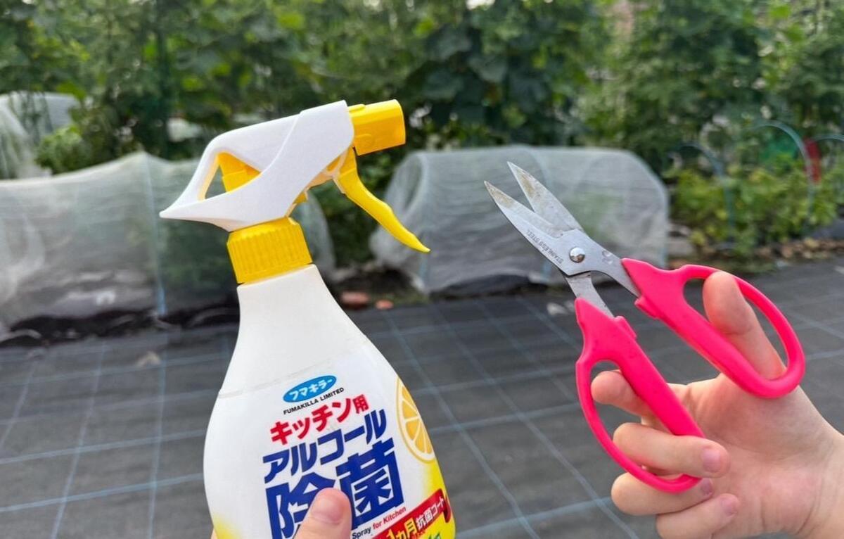シェア畑に通うようになってから、最初にハサミの刃を消毒してから作業を始めるのが習慣になりました。切れ味の良いハサミを使うことが大事だそう。切れ味の悪いハサミで切ると細胞が潰れてしまい切り口から腐る原因になるため、清潔で、よく切れるハサミを使用します。