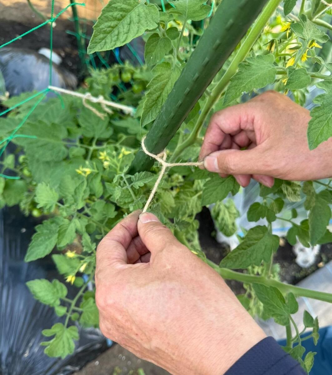 「キツく結ぶと茎が傷むので注意してください」と教えてくださった菜園アドバイザーさんの結び方をじっと見つめました。ほどよくゆるみがあります。